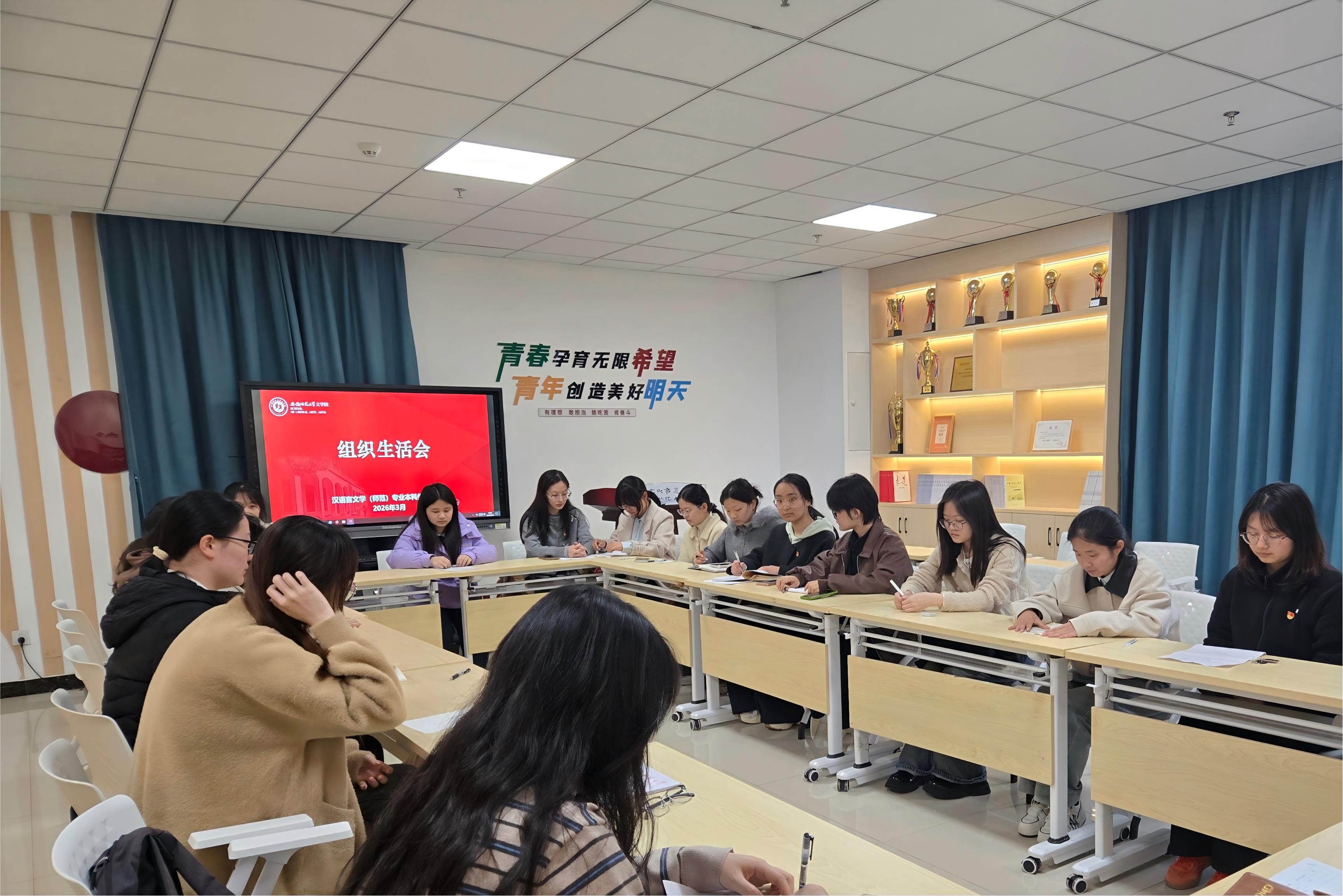 3月22日,文学院汉语言文学师范专业本科生党支部在文学院F111会议室召开组织生活会。党支部书记吴佳惠主持会议,支部全体党员参加。