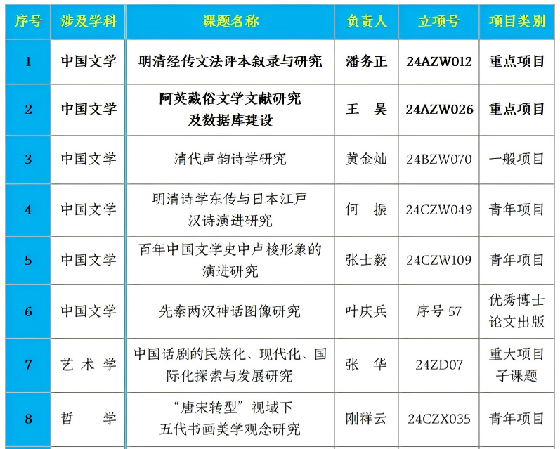 近期,全国哲学社会科学工作办公室公布了2024年国家社会科学基金各类项目立项结果。本年度,我院共新增8项,其中重点2项,青年3项,一般1项,重大项目子课题1项,后期优秀博士学位论文出版1项(为我校首次获批)。中国文学学科立项总数居全国前列(并列第二)。