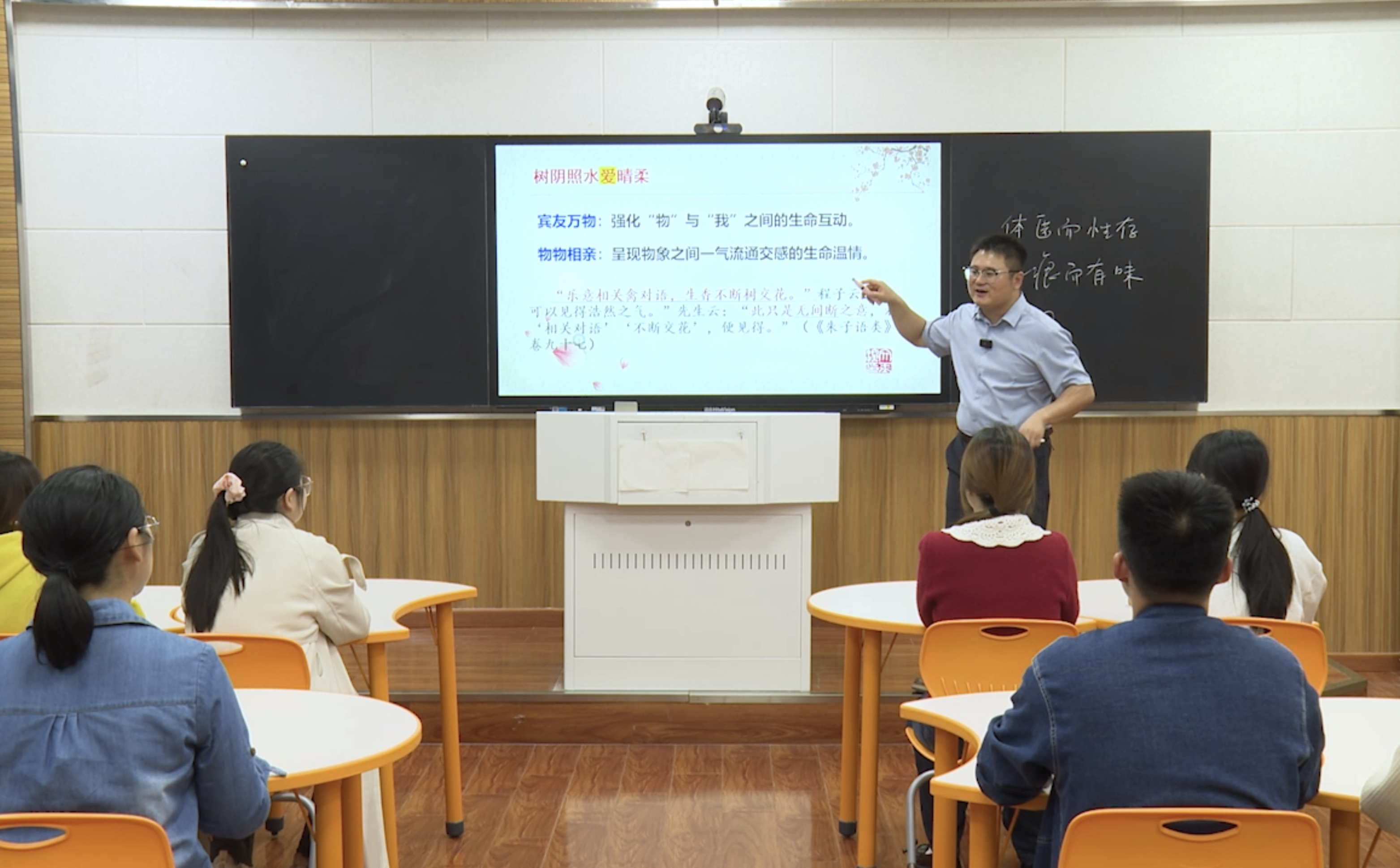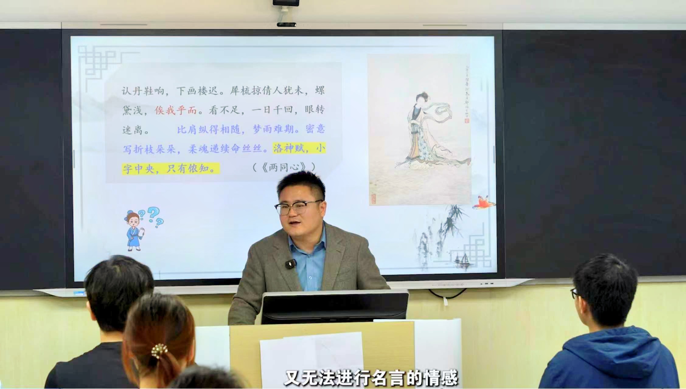 在马涛老师的教学理念中,“中国古代文学”体现课程魅力最好的方式,在于引领学生切实感悟到经典作品的精深华妙,使其情动于中、智觉于心,爱而难舍,真正对课程产生兴趣。他认为古代文学教学的趣味性(感性)与学术性(理性)犹如鸟之双翼,不可分隔。推源而论之,两者的实现首先基于教师对经典的深度涵泳:教师惟有真正地“入乎其内”,借助自己的知识背景、情感体验、思维习惯、审美经验等对作品中的意趣有所深切感知,并进而“出乎其外”,予以评析,这样的文学解析才不会肤浅浮泛,而是能入微破翳。总之,只有教师深切研读作品并全情融入到艺境之中,才能达到“以心传心”“以心感心”乃至“显妙道于自然”“润灵根于无声”的境界。马涛老师将自己的全身心情感带入课堂,用澎湃的激情与深刻理解,营造出一个充满感染力的场域,与学生们一同穿越时空,共同探索和感悟古人的智慧与情怀。他的课堂因此而充满温度,学生们在他热情洋溢的引领下,不再是被动地记录,而是主动地感受、思考与共情,真正体会到文学的生命力,真正发自内心地与文字相拥。