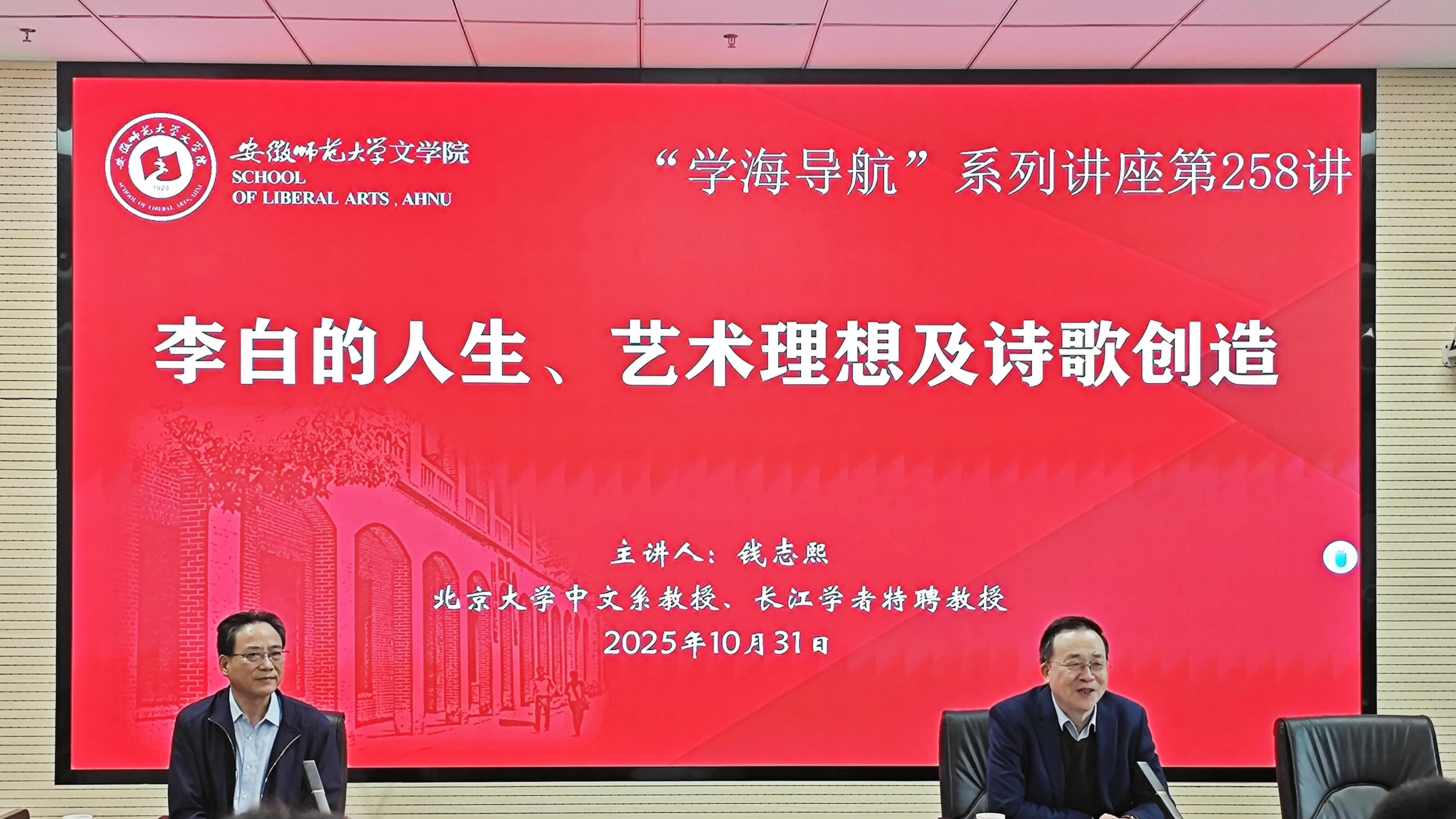 2025年10月31日下午,“学海导航”系列讲座第258讲在文典楼F108报告厅举行。本次讲座特邀北京大学中文系教授、长江学者特聘教授钱志熙担任主讲人,由安徽师范大学教授、博士生导师胡传志主持,百余名文学院师生齐聚现场,共同探究唐代诗人李白的文学世界。