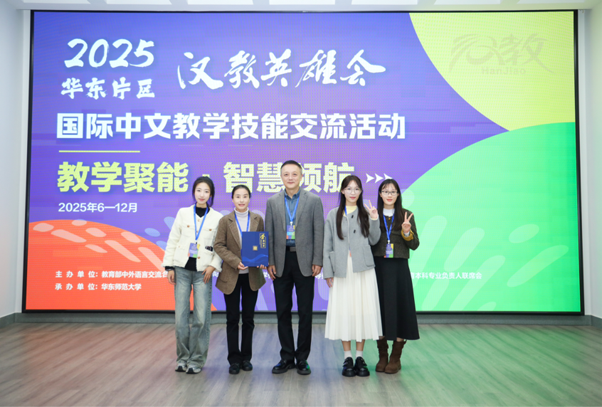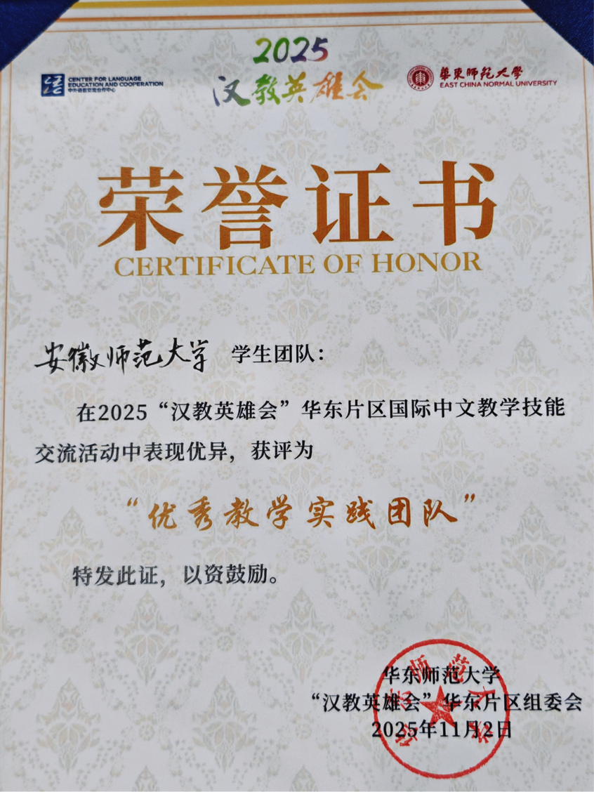 11月1日至2日,由教育部中外语言交流合作中心主办、以“教学聚能,智慧领航”为主题的2025年汉教英雄会华东片区交流活动在华东师范大学举行。安徽师范大学研究生团队“语桥文沁队”凭借《一日三餐》主题教学设计中语言教学与徽菜文化的创新融合,斩获“优秀教学实践团队”荣誉称号,彰显学校汉语国际教育学科实践育人实力。