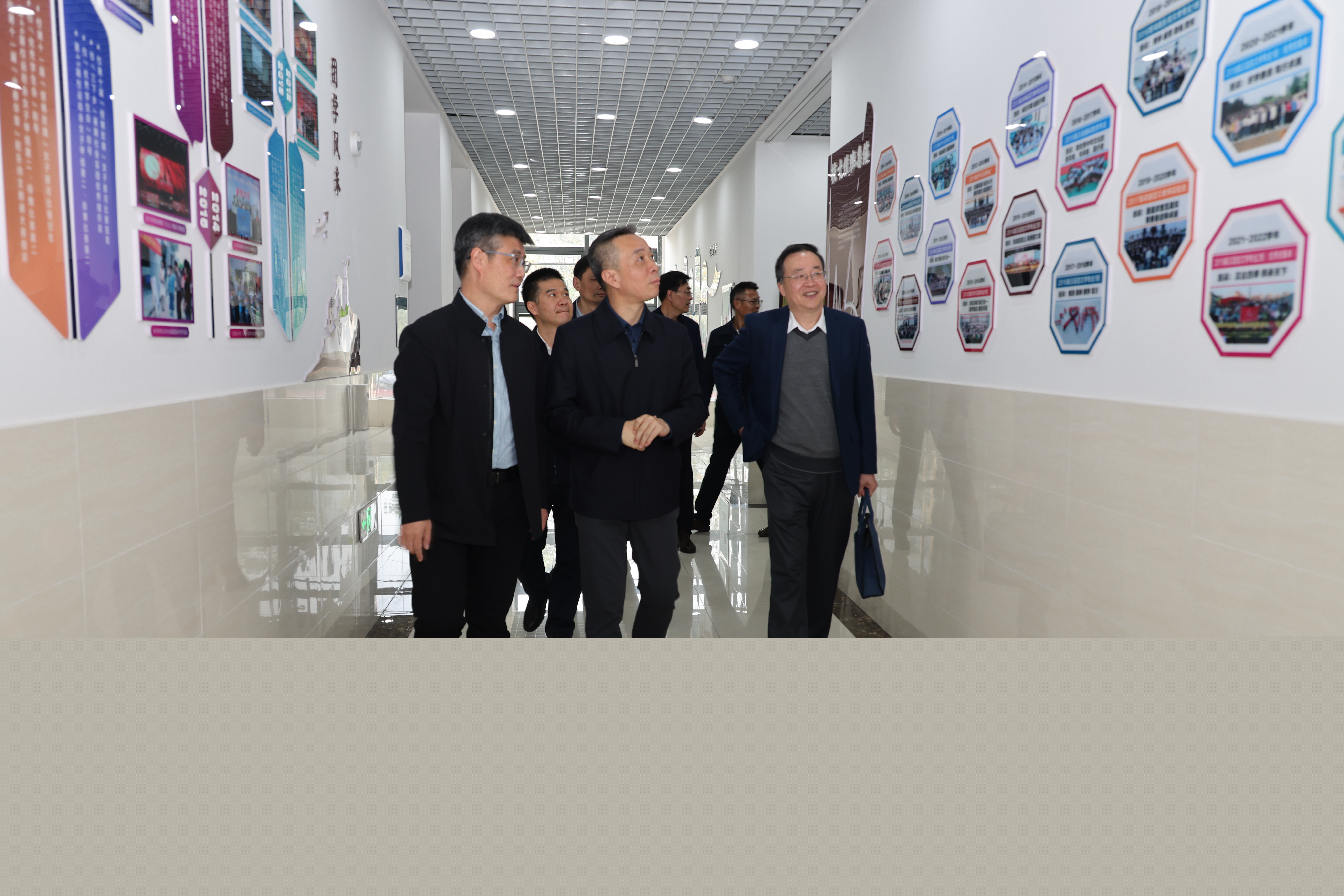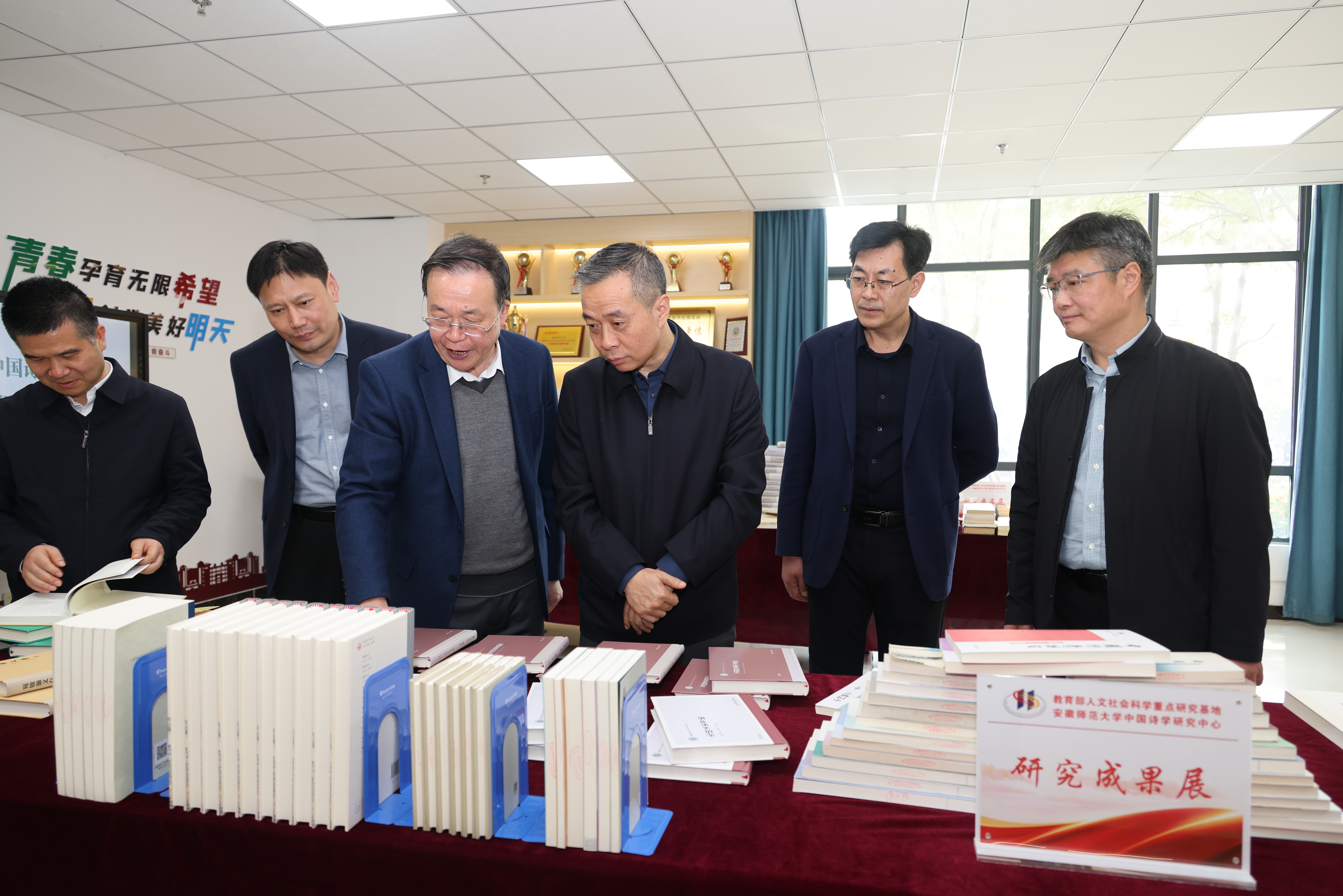 康教授在调研中观看了文学院文化墙,项念东院长介绍了学院的发展历程、资深专家学者以及人才培养等方面取得的成绩;随后,康教授参观了教育部人文社会科学重点研究基地安徽师范大学中国诗学研究中心成果展,胡传志主任在简要介绍基地办公环境、人员配置、藏书资源、学术交流与社会服务等情况的基础上,重点汇报了基地近年来开展的科研工作与取得的重要成果。康教授对文学院开展的工作和取得的成绩给予了高度好评,认为文学院底蕴深厚、名家辈出,近些年潜心育人才、扎实办基地,取得的成果喜人、发展前景可期。