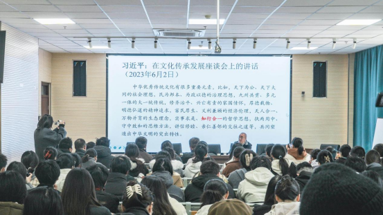 项开喜教授以具体语用实例切入,从中华优秀传统文化“知行观”出发,阐释“知行关系”在语言系统中的映射逻辑。他从实际语言现象出发,围绕事理关系、认知态度与动作行为三个维度,列举语用实例,构建语义关系链,系统阐释了语言表达中“事理-认识-行为”的“三合一”现象。讲解过程中,项教授兼顾通识性与学理性,既降低了语言学理论与概念的专业门槛,又引导听众深入体悟“知行合一”的思想内涵。他还梳理了认知情感类动词的语义演变模式,从看似分散的语言现象中提炼出具有普遍性的规律与抽象规则。讲座尾声,项教授聚焦于新时代语言学的发展使命,强调语言科学研究应积极服务国家战略与人民需求,引领大科学时代的学术前沿。