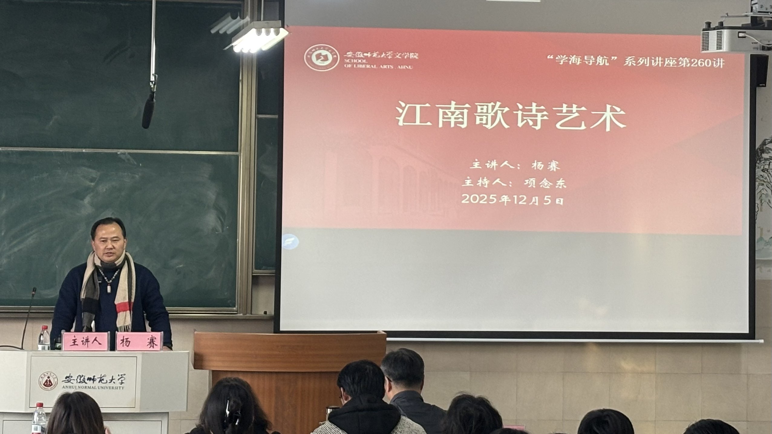 2025年12月5日下午,“学海导航”系列讲座第260讲在行知楼2050303教室举行。本次讲座特邀上海音乐学院研究员、博士生导师杨赛教授担任主讲人,由安徽师范大学文学院党委副书记、院长项念东教授主持,百余名文学院师生齐聚现场,以“江南歌诗艺术”为主题,共赴一场诗乐交融的文化盛宴。