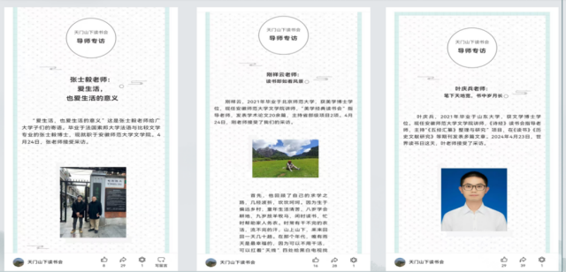 读书会一方面以各位指导老师自身研究专长为基础,为广大学子提供《诗经》《文心雕龙》《卡拉马佐夫兄弟》等可以深入精读的多元化经典选项,以此训练学生的判断力和思辨力;另一方面组织开展指导老师系列专访活动,生动再现老师们的求学成长道路,希望以此熏陶、感染学生,拉近学生与老师们的心理距离,点燃学生的学术热情,吸引更多优秀本科生报考硕士研究生。