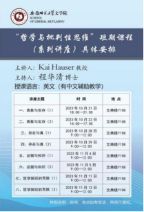 2023年10月下旬到11月中旬,安徽师范大学文学院还特邀德国柏林工业大学的逻辑学家Kai Hauser教授为学院师生线下开设“哲学与批判性思维”全英文短期课程(八讲,32学时),“逻辑与哲学”读书会指导老师程华清博士全程辅助教学。课程为学生提供了足不出院就能直接体验海外名师线下授课风采的宝贵机会,极大开拓了学生的知识视野、激发了学生的探索兴趣。学生课后纷纷留言分享学习收获,表达对学院的感谢之情。