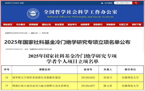 近日,全国哲学社会科学工作办公室公布了2025年国家社科基金“冷门绝学”研究专项立项名单。我院何家兴教授领衔申报的《清华简文字构形系统研究及数据库建设》(25VJXG032)和陈元贵教授领衔申报的《明清以来江南目连戏与地方剧种互动关系研究》(25VJXG077)喜获立项,这是我校“十四五”期间该类项目的首次立项。至此,文学院2025年度新增国家级科研项目凡16项,为学院“十五五”高起点开局奠定了坚实的学科基础。