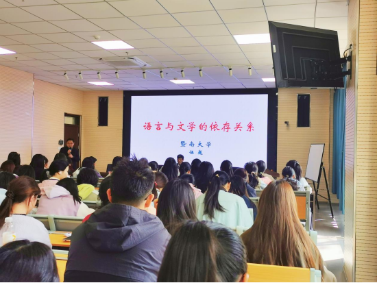 为帮助文学院学生厘清语言与文学的内在关联,夯实专业知识基础,提升文学鉴赏与语言运用能力,3月29日上午,文学院“学海导航”系列讲座在文典楼F108报告厅顺利开讲。本次讲座特邀暨南大学伍巍教授主讲,以“简谈语言与文学的关系”为主题,全院学生到场聆听,共赴一场语言与文学的学术盛宴。