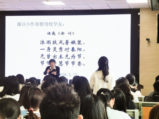 此外,伍巍教授特别带来安徽师范大学老教师的诗词鉴赏内容,深情解读宛敏灏先生《江津白沙镇》、张涤华先生《书愤》等经典诗作。他结合时代背景与诗人心境,逐句剖析诗词中的语言精妙之处与深厚情感,让同学们在感受经典诗词魅力的同时,进一步体会语言与文学融合的独特韵味,也感受到老一辈学者的人文情怀与学术底蕴。