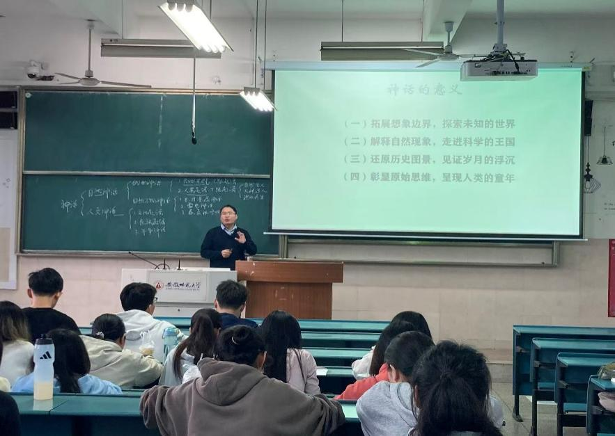 黄诚祯老师教学经验丰富,课堂驾驭能力强,曾多次在校级教学创新大赛与教师智慧教学大赛中收获佳绩。课堂上,他以清晰的逻辑架构将“神话”这一宏大而古老的命题拆解为四个层层递进的核心维度,带领在场师生开启了一场深度的神话之旅:(一)拓展想象边界,探索未知的世界;(二)解释自然现象,走进科学的王国;(三)还原历史图景,见证岁月的浮沉;(四)彰显原始思维,呈现人类的童年。四个板块由表及里、由文学而哲学、由想象而实证,构建了一个完整的认知闭环。