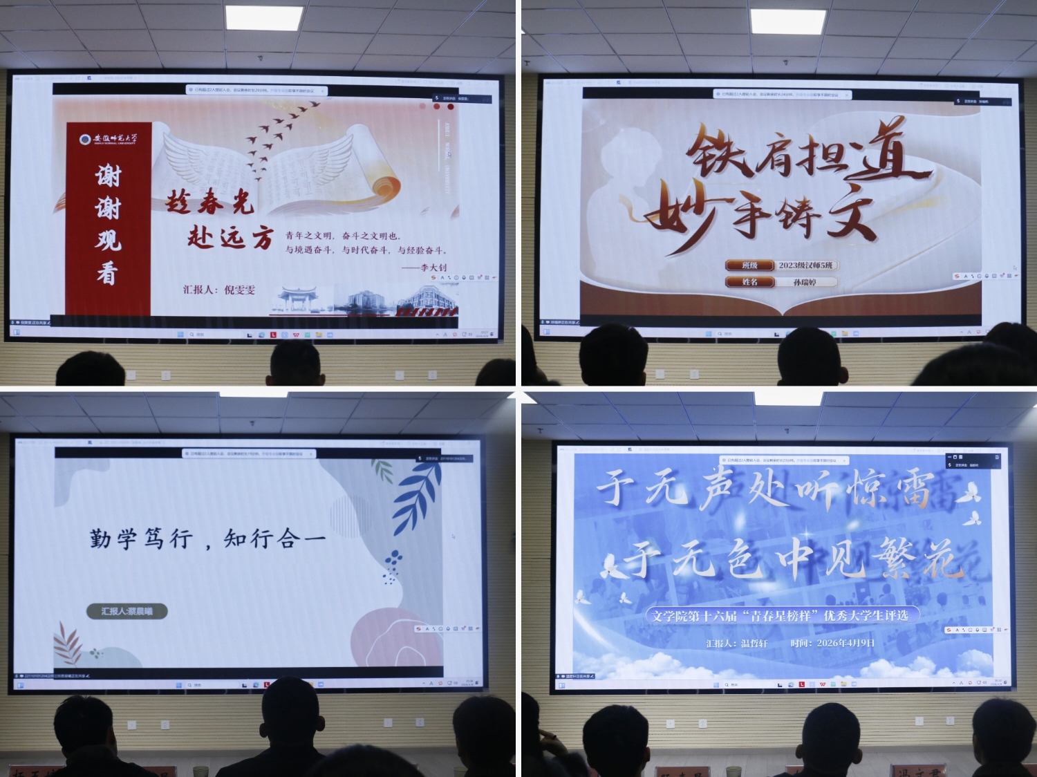 4月9日晚,安徽师范大学文学院第十六届“青春星榜样”优秀大学生评选汇报会在文典楼F108教室举行。文学院党委副书记左方敏老师、各年级辅导员老师担任评委,各年级学生代表到场参与。本次活动旨在展现学子昂扬向上的精神风貌,营造勤学善思、笃行致远的学院氛围,树立德才兼备的学生典型,激励广大同学奋发有为、全面发展。