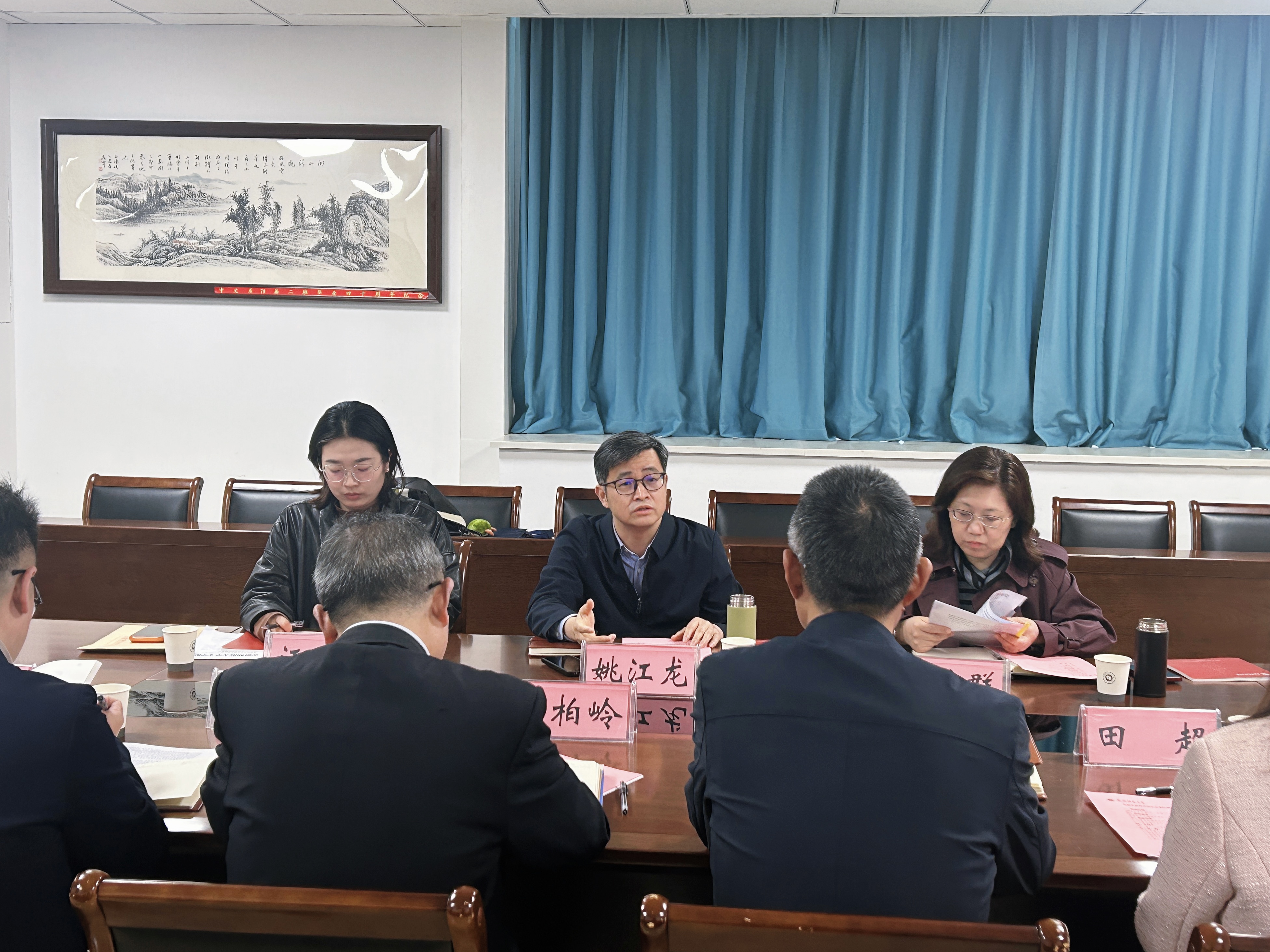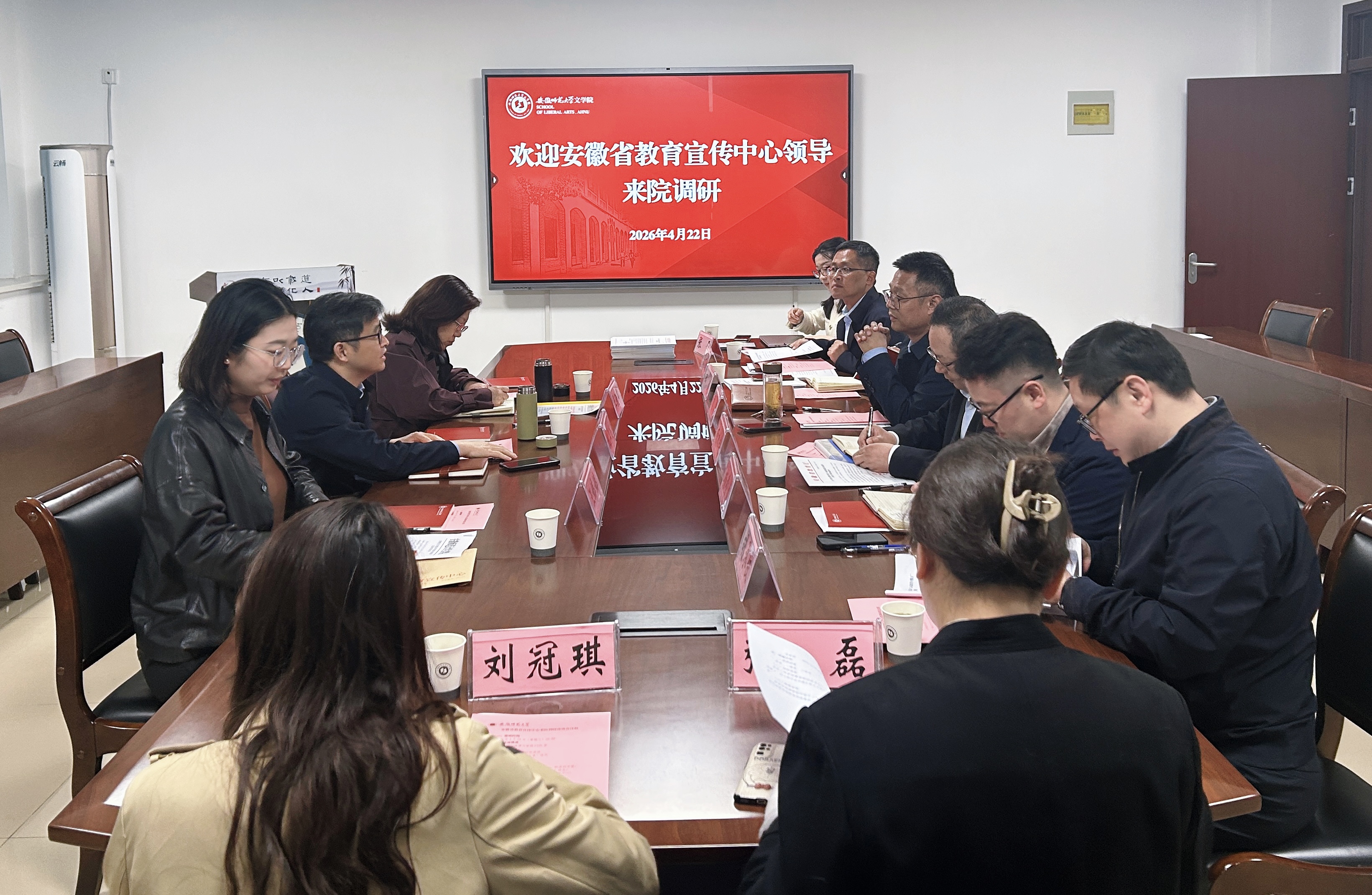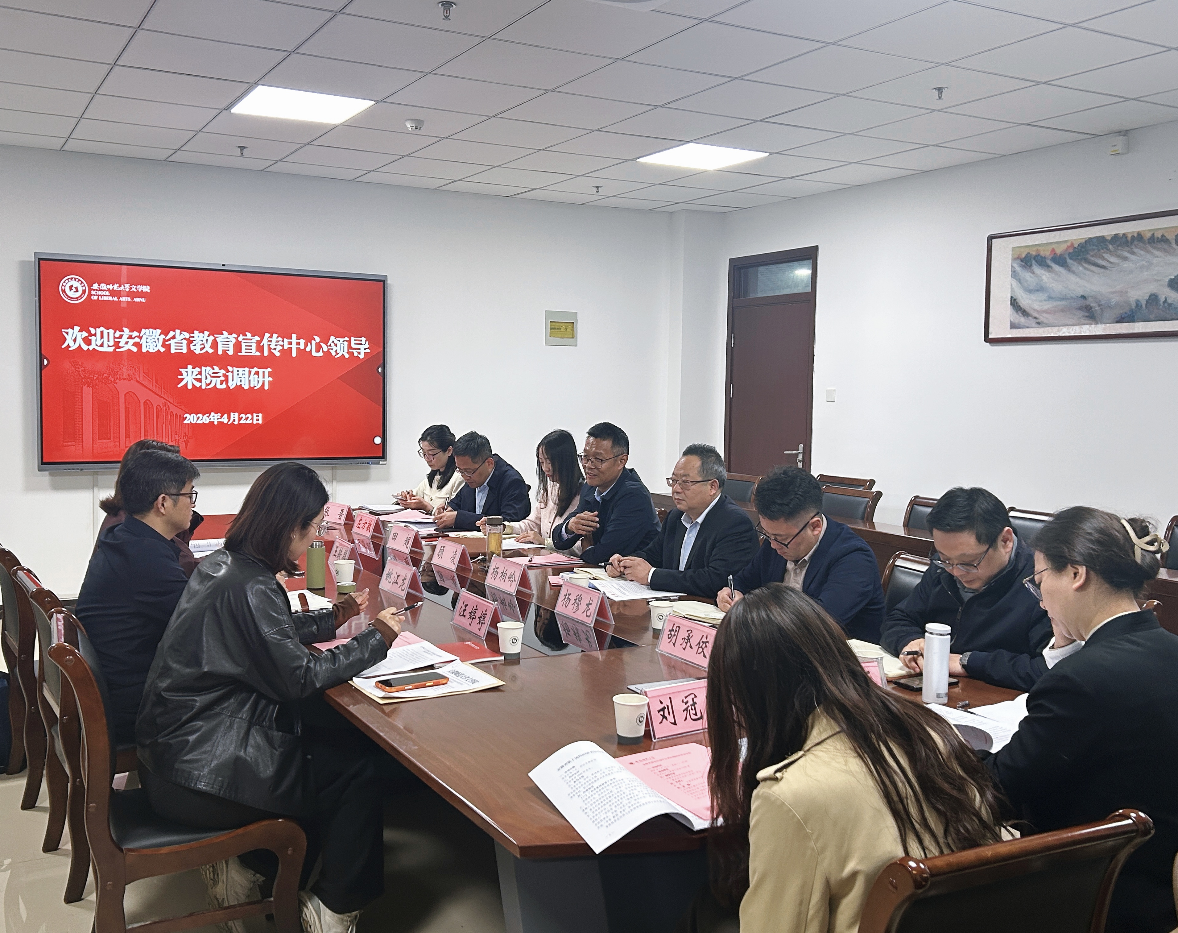4月22日,安徽省教育宣传中心主任姚江龙、副主任王轶群、《安徽教育》负责人汪婷婷一行来安徽师范大学文学院调研,重点围绕安徽省校园读书创作活动、“徽派语文名师工作室”设立等内容开展座谈交流。安徽师范大学中国诗学研究中心主任杨柏岭,党委宣传部副部长田超、杨穆龙,文学院领导班子以及教师代表等参加座谈。会议由文学院党委书记顾凌主持。