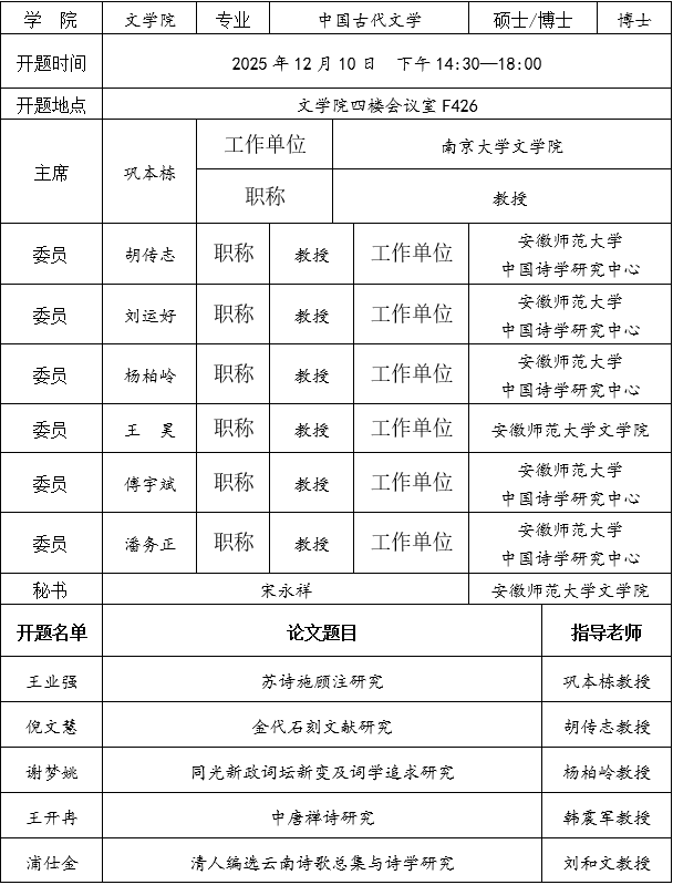 文学院中国古代文学专业2024级博士研究生学位论文开题公告