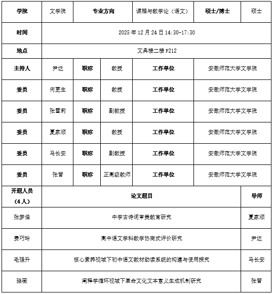 文学院2024级课程与教学论(语文)专业硕士研究生学位论文开题公告