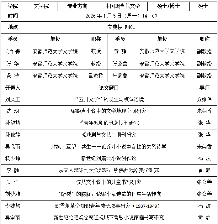 中国现当代文学专业2024级硕士研究生毕业论文开题公告