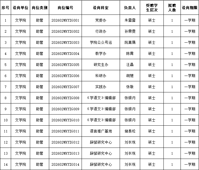 文学院2025-2026学年第二学期研究生助管岗位设置汇总