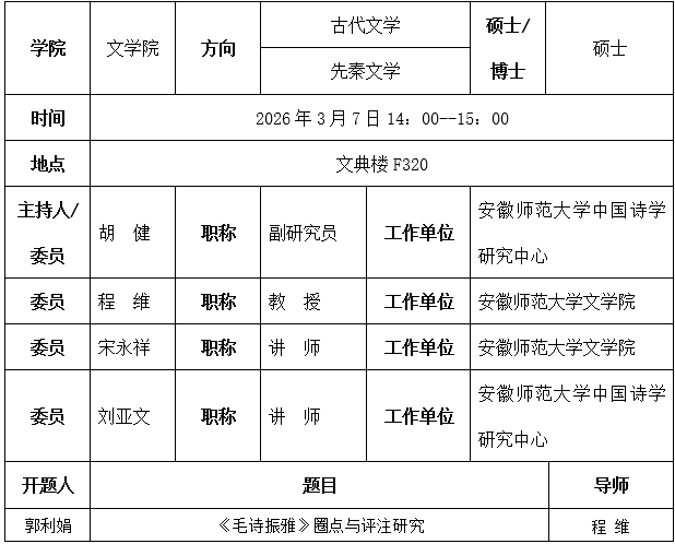 文学院古代文学2021级同等学力硕士研究生开题公告