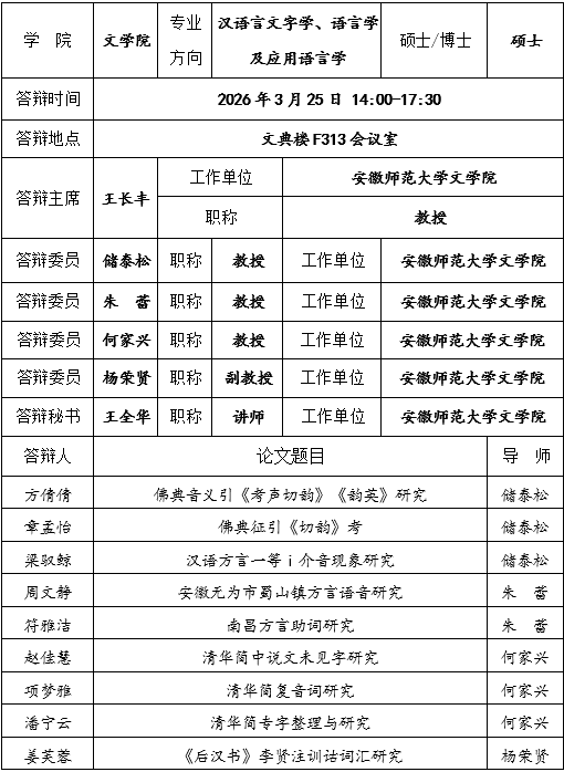 汉语言文字学、语言学及应用语言学专业古代汉语方向 2026届硕士研究生学位论文预答辩公告