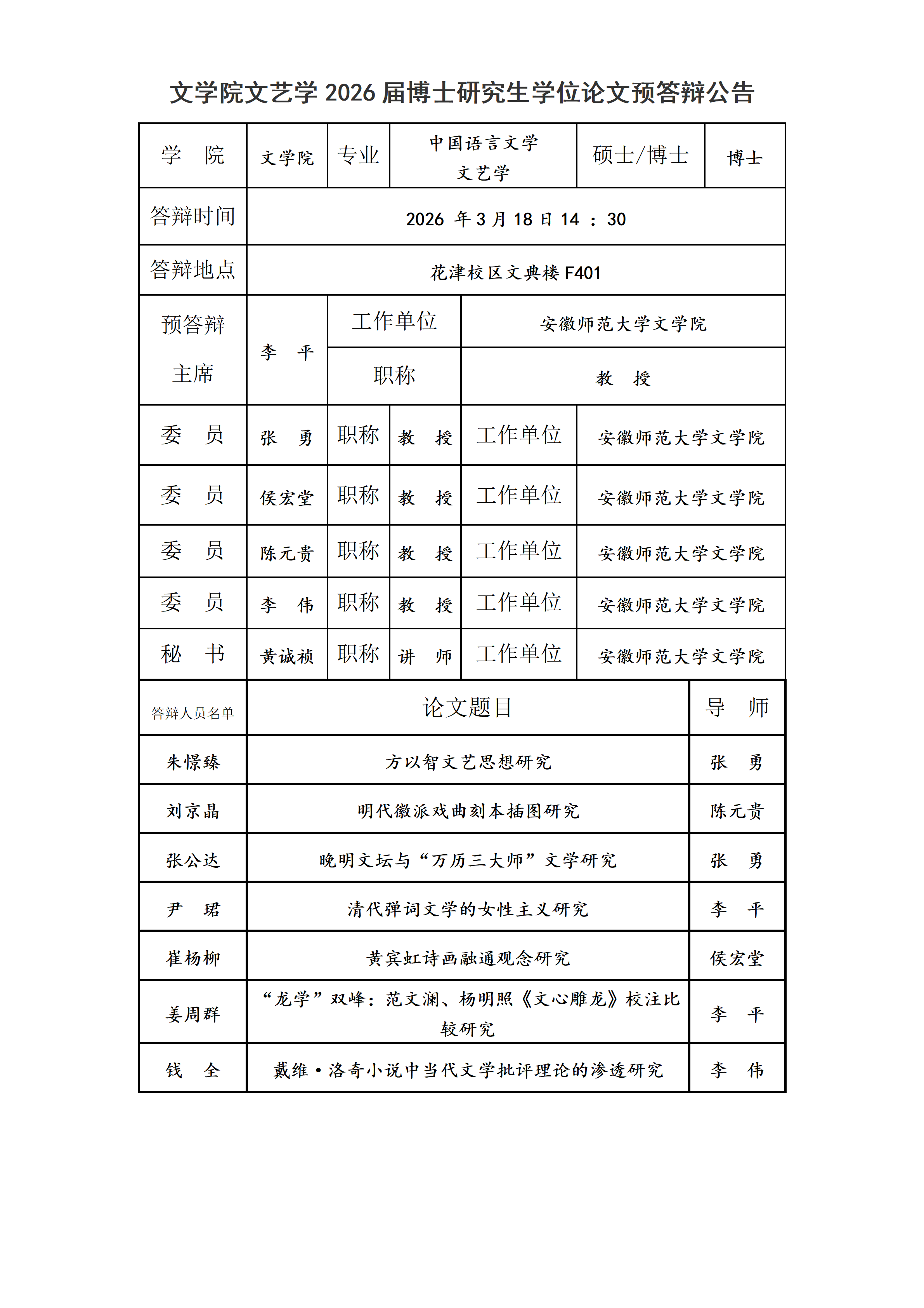 文学院文艺学2026届博士研究生学位论文预答辩公告