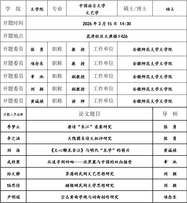 文学院文艺学2024级硕士研究生学位论文开题公告