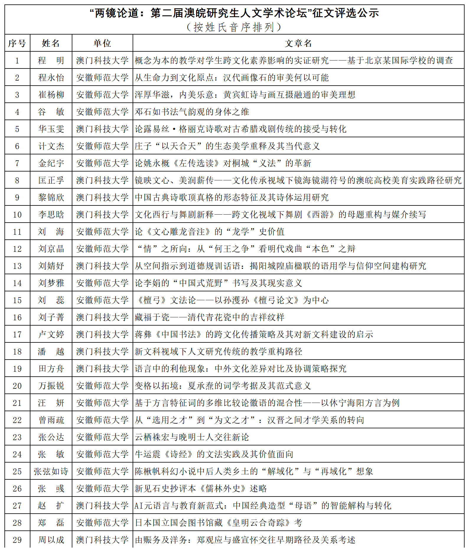 根据《两镜论道:第二届澳皖研究生人文学术论坛征文通知》,论坛主办方根据论文学科方向,聘请校内外专家对符合征文条件的应征论文进行匿名评审,现将入选结果公示如下: