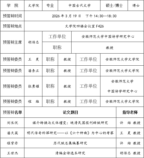 中国古代文学2026届博士研究生学位论文预答辩公告