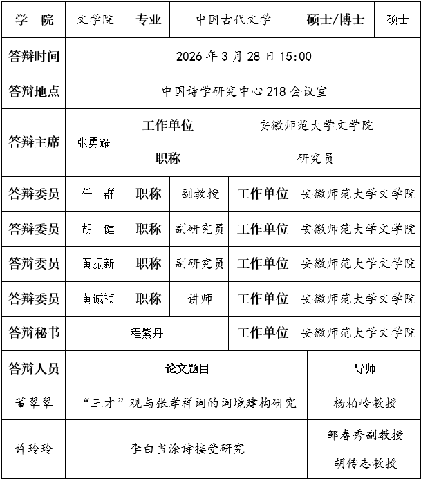 中国古代文学专业2026届同等学力硕士研究生学位论文预答辩公告