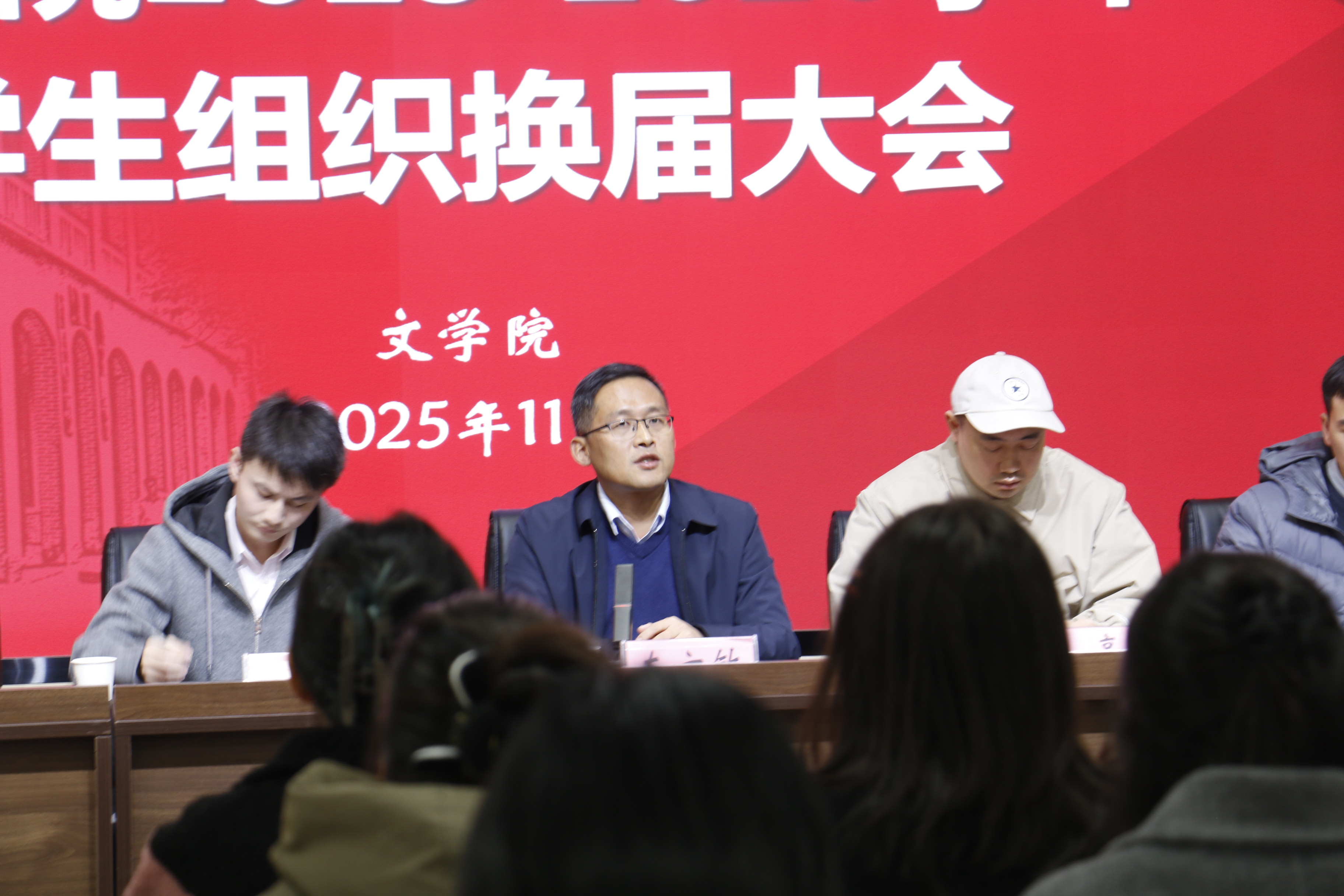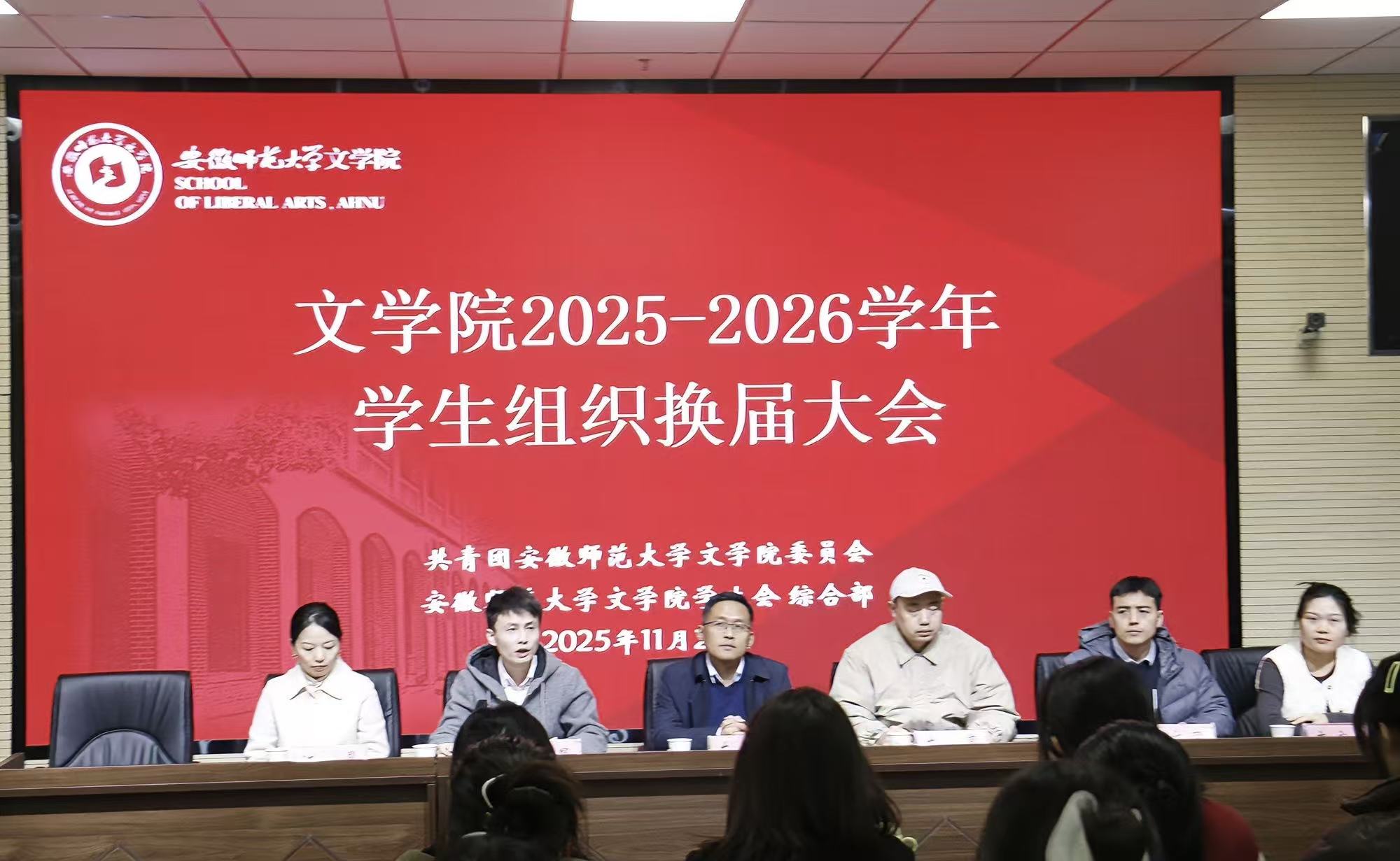 2025年11月25日下午,文学院在文典楼F108报告厅举行2025-2026学年学生组织换届大会。文学院党委副书记左方敏、太阳话剧社指导老师左亮、研究生秘书汪晶、团委书记阮熹晟、团委副书记冯文君及辅导员代表唐宇晴出席,大会由阮熹晟主持。