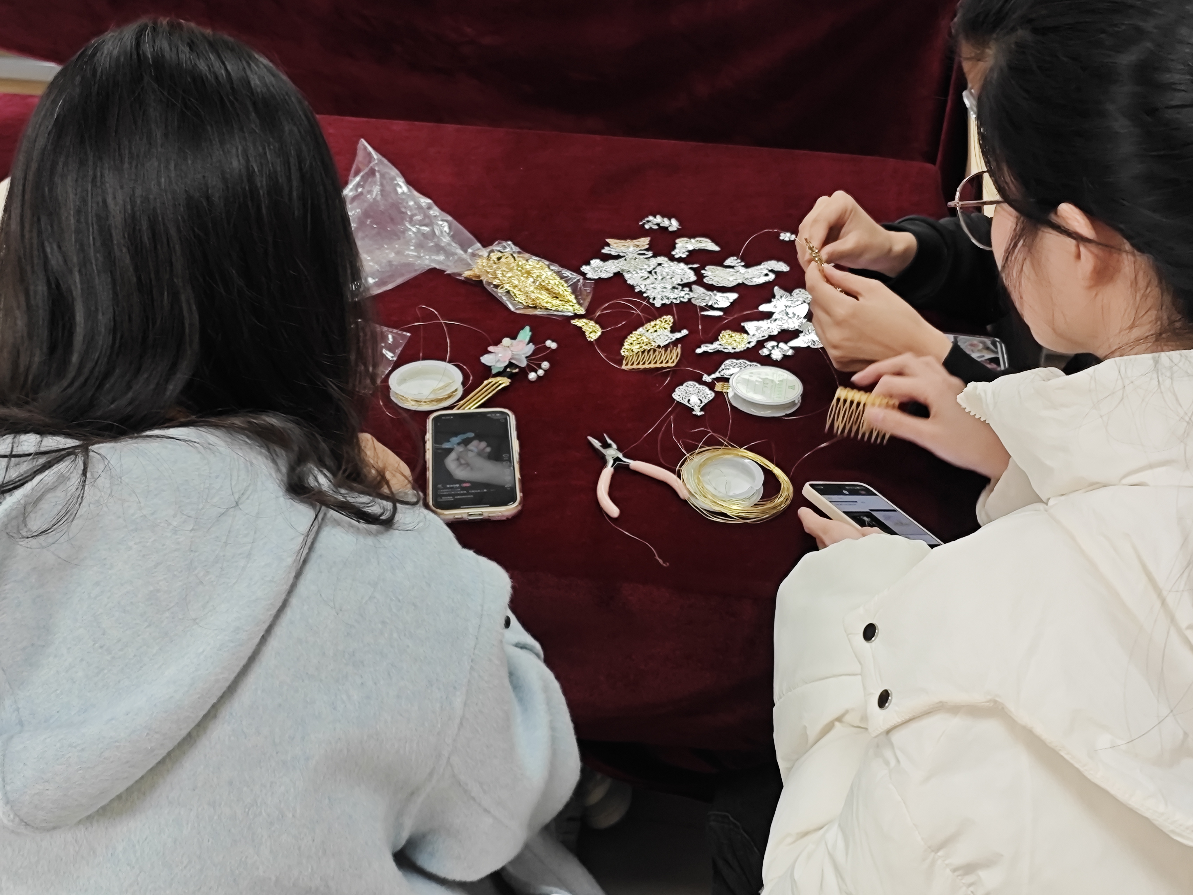 动手实践环节,会员们化身"手艺人",在理事们的巡回指导下潜心创作。大家精心挑选材料、设计造型,将零散部件逐步拼接成独具个性的发簪,穿珠引线间尽显巧思。专注温馨的氛围中,传统工艺与现代审美碰撞交融,每位参与者都在实践中体会到非遗技艺的精妙。