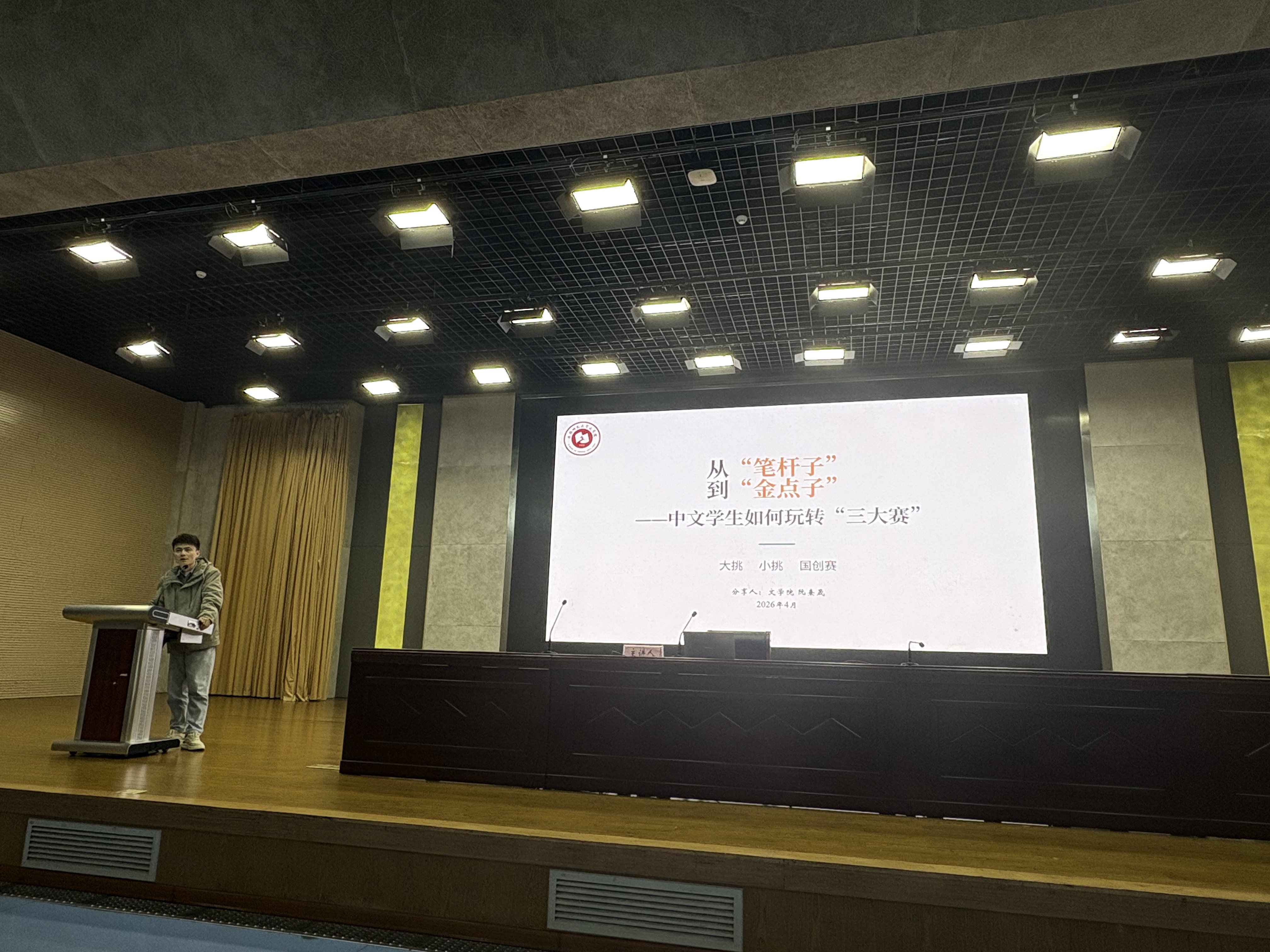 阮熹晟为寝室长作题为《从“笔杆子”到“金点子”——中文学生如何玩转“三大赛”》的学科竞赛培训。他系统梳理了“大挑”“小挑”以及国创赛的区别与联系,并结合中文专业的学科优势,重点讲解了如何将扎实的文本能力转化为竞赛中的“金点子”。阮熹晟特别指出,寝室作为学生日常交流最密切的单元,完全可以成为组队研讨、打磨项目的第一阵地,寝室长可以发挥组织作用,带动室友共同投身学科竞赛。整场培训干货满满,现场反响热烈。
