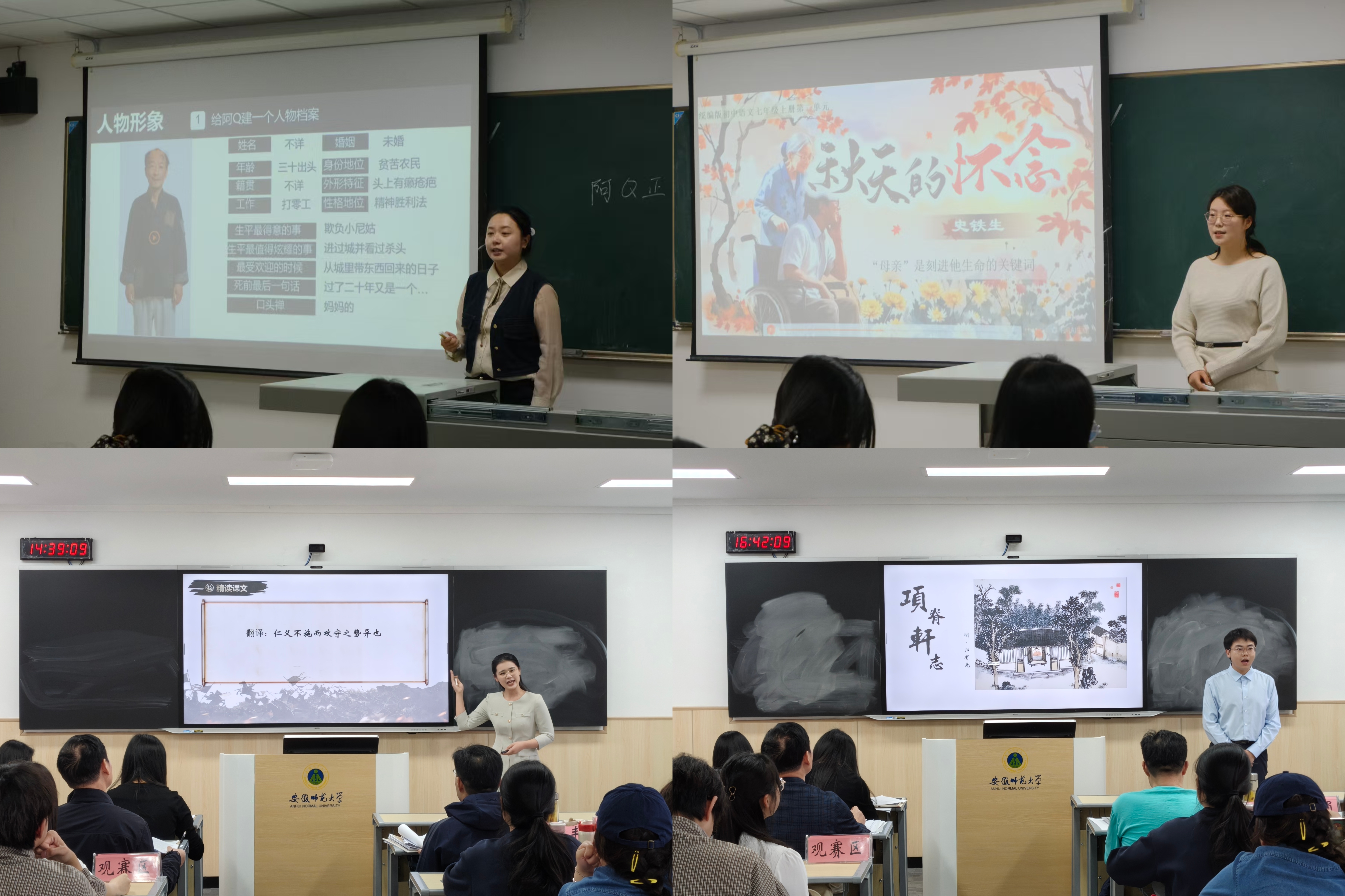 技能比拼展风采,三尺讲台砺精兵。决赛现场,参赛选手们以多样化的视角进行教学展示。付婷同学通过《百合花》中的“破洞”意象走进人物的心灵世界;张梦佳同学以《致云雀》献上一曲追求自由的青春礼赞;刘芳筱同学结合现代社会语境,对《阿Q正传》中的“精神胜利法”进行讨论。李冉同学围绕“仁义不施而攻守之势异也”,辨析《过秦论》中秦攻守之势转变与仁政得失的深层关联。选手们将课堂知识与日常生活相结合,在教学内容中融入批判性思考,展现出扎实的专业素养。