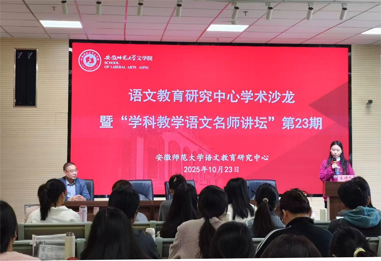 2025年10月23日,安徽师范大学语文教育研究中心学术沙龙暨“学科教学语文名师讲坛”第23期成功举办。本次活动特邀安徽省五河县第一中学副校长、“虹城名师工作室”主持人、蚌埠市第五届学科带头人、市学科教学名师鲍广润老师主讲,2025级学科教学(语文)专业研究生参加学习,活动由张晋主任主持。