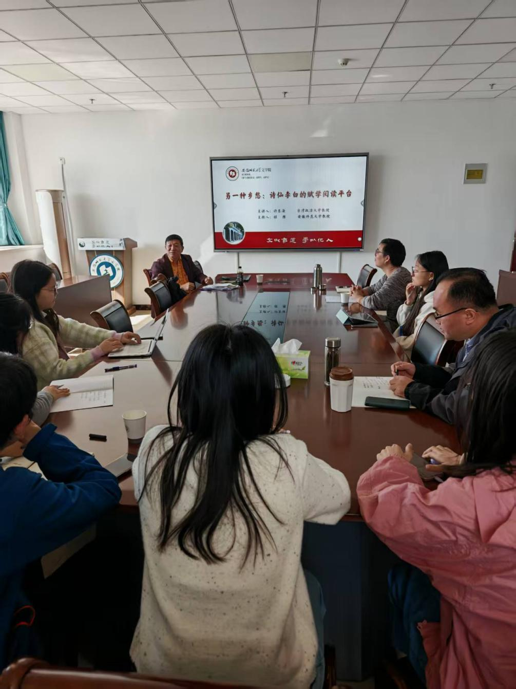 2025年10月24日上午,安徽师范大学文学院“中国古代文学与文献研究团队”主办的学术讲座在文典楼F426会议室如期举行。台湾政治大学中文系博士生导师许东海教授应邀为我院师生带来了一场题为“另一种乡愁:诗仙李白的赋学阅读平台”的专题报告。讲座由文学院程维教授主持,中国诗学研究中心胡健老师以及部分古代文学专业研究生参与了本次讲座。
